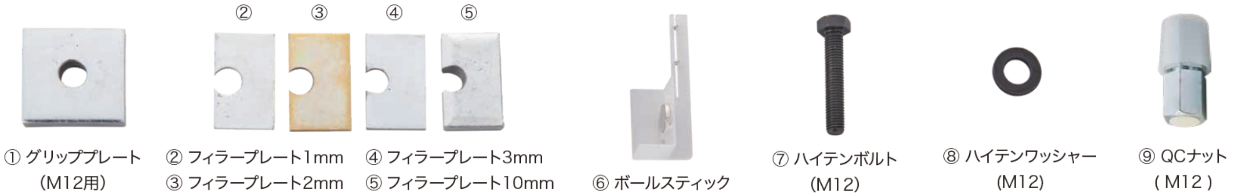 ※1セットの内容はグリッププレート2枚、ボールスティック2個、ハイテンボルト2本、ハイテンワッシャー2個、QCナット2個に加え、両側分のフィラープレト必要枚数(フランジ厚により変動します)が含まれます。